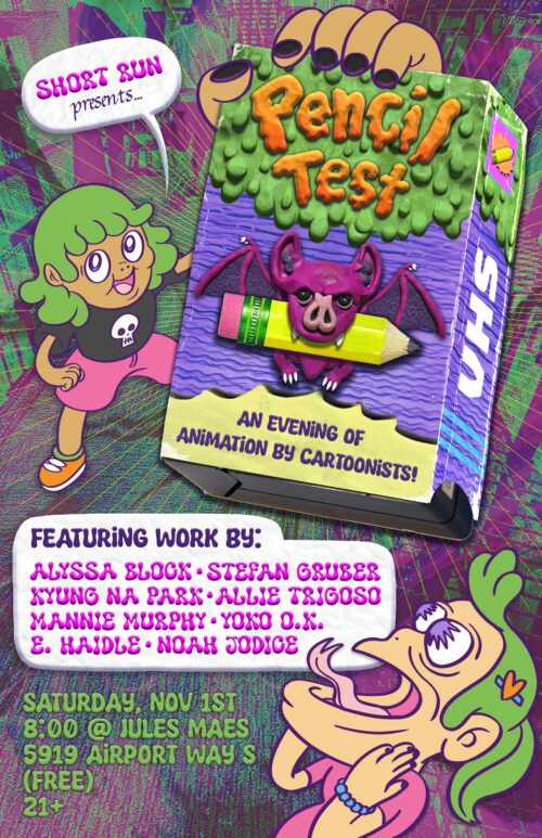 Pencil Test: Underground Animation Showcase curated by Portland artist Mannie Murphy featuring Murphy, Yoko OK, Stefan Gruber, E. Haidle, Allie Trigoso, Noah Jodice, Alyssa Block, and Kyung Na Park, optional Bacon Strip drag show to follow (tickets required).
